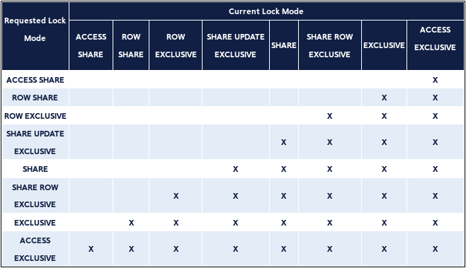 - ACCESS EXCLUSIVE는 모든 락과 충돌 (X) → ALTER TABLE 중에는 모든 접근 차단